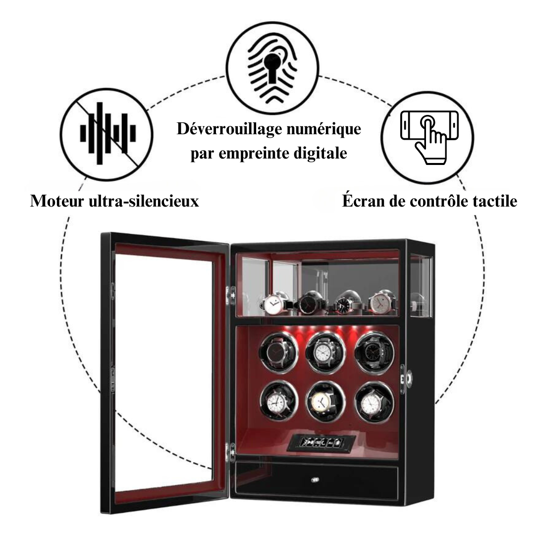 Avec 6 emplacements, ce remontoir est parfait pour ma collection grandissante. Tout est bien maintenu, la rotation est silencieuse et le design reste élégant malgré sa grande capacité.